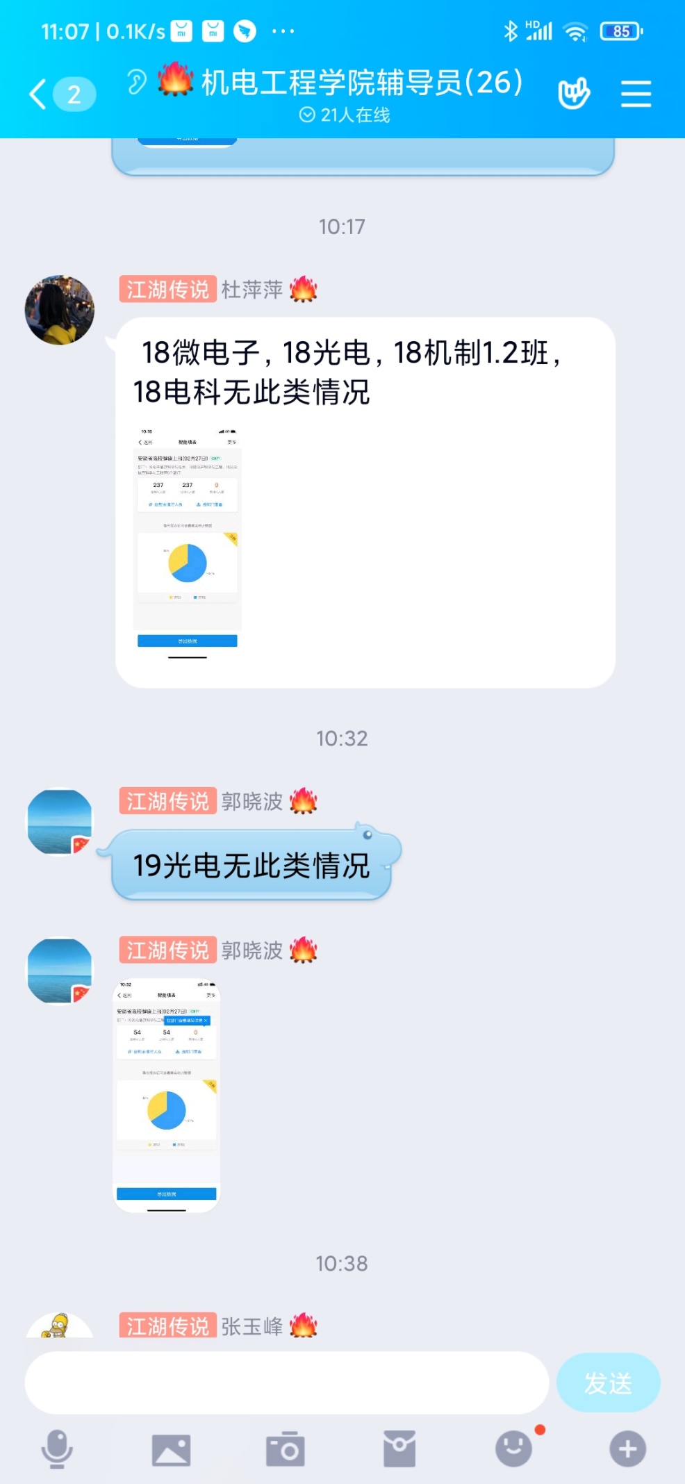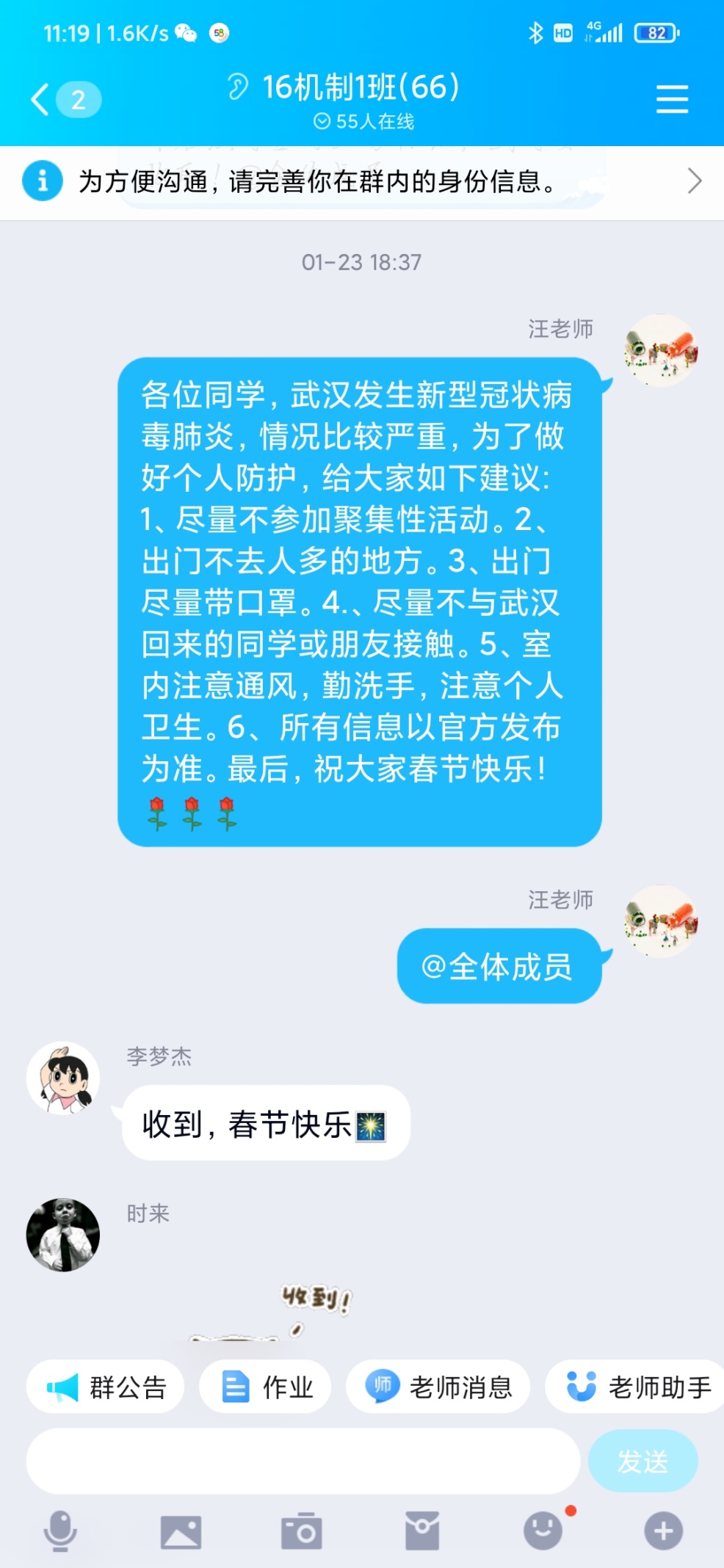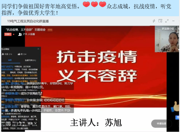 加强党团和班级建设。新冠肺炎疫情发生以来,辅导员老师们居家在线召开“云班会”,号召班级党员和团员积极行动起来,投入到属地的疫情防控中去。疫情就是命令,责任就是担当,员工党员、团员们积极响应,主动请缨,协助居住地开展疫情防控工作,奋战在疫情防控的基层第一线。有的员工党员还发挥自身特长,制作了多部战“疫”视频。班集体积极开展相应防疫主题团日活动,并合理运用新媒体,在QQ、微信、抖音等网络平台上传递战“疫”正能量。目前,有30个团支部和6个员工党小组分别推送了多部歌颂祖国、防疫宣传知识和为武汉加油的视频,展现了齐心协力、共克时艰的强大力量。